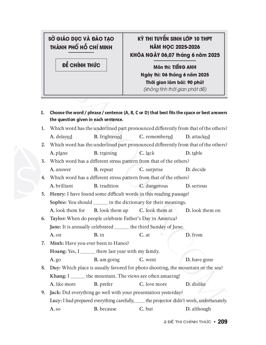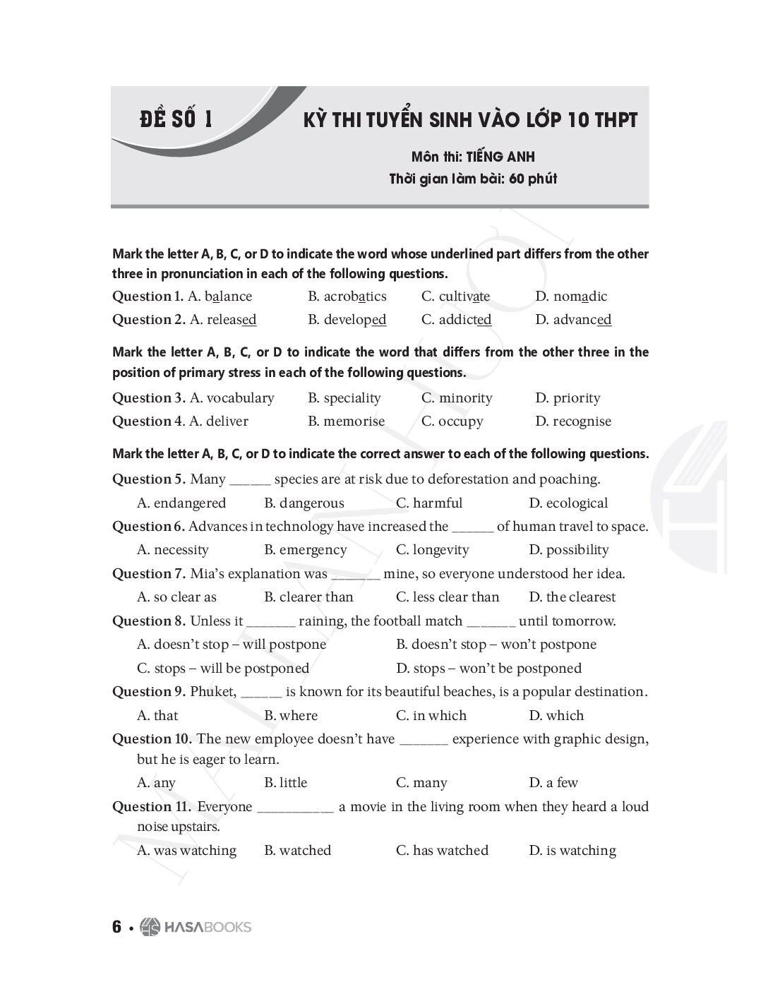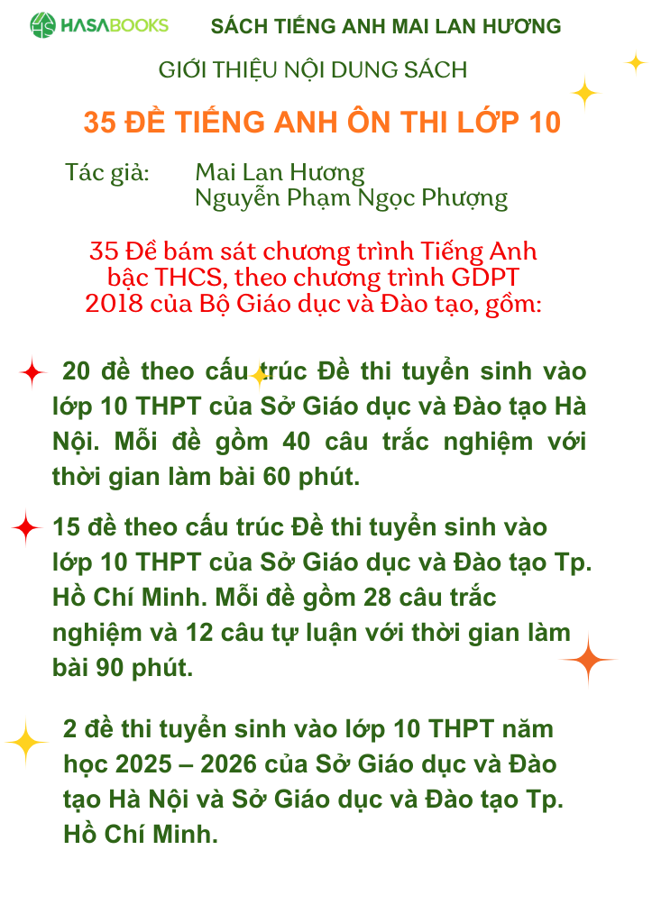 Đề Tiếng Anh – với 35 đề thi mẫu và luyện tập cho kỳ thi vào Lớp 10 của cô Mai Lan Hương và cô Nguyễn Phạm Ngọc Phượng, được biên tập và xây dựng bám sát theo chương trình Giáo dục Phổ thông 2018 của Bộ Giáo dục và Đào tạo của chương trình Tiếng Anh bậc Trung Học Cơ Sở (THCS).